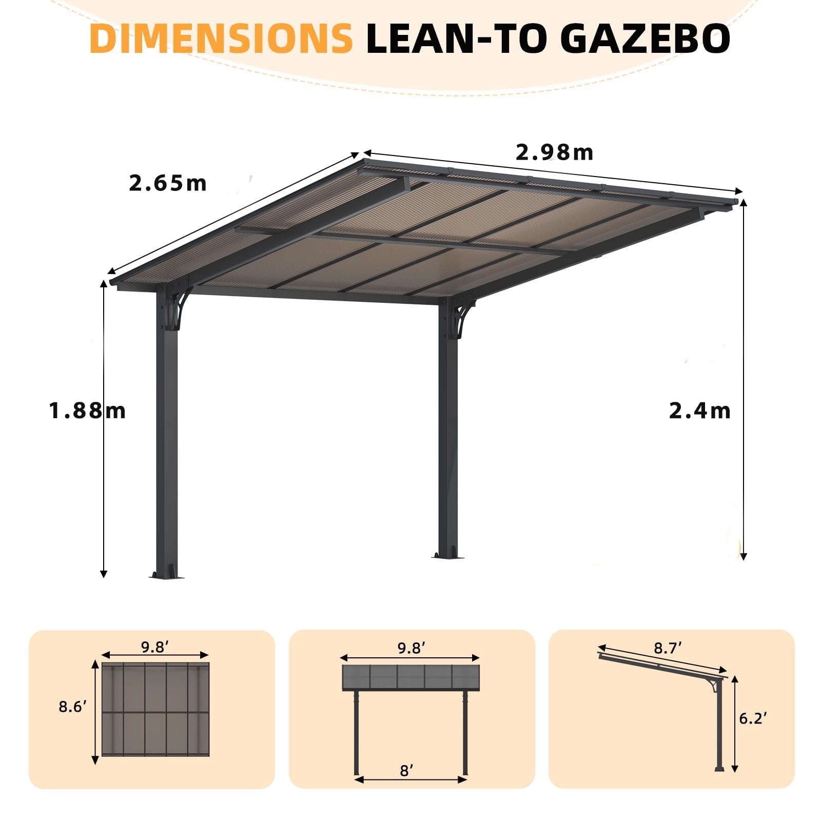 YODOLLA 3x2.6m Freestanding Hardtop Lean to Gazebo Pergola for Patio