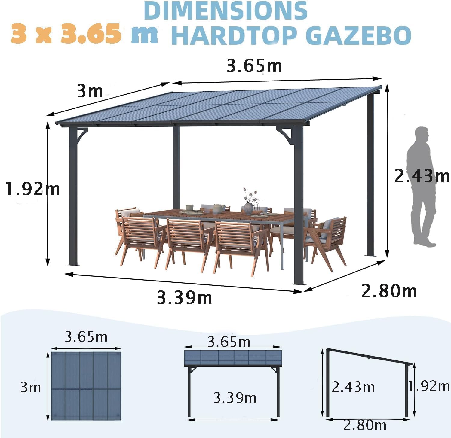 YODOLLA 3x3.65m Aluminium Lean-to Gazebo Wall-Mounted Hardtop Roof Pergola