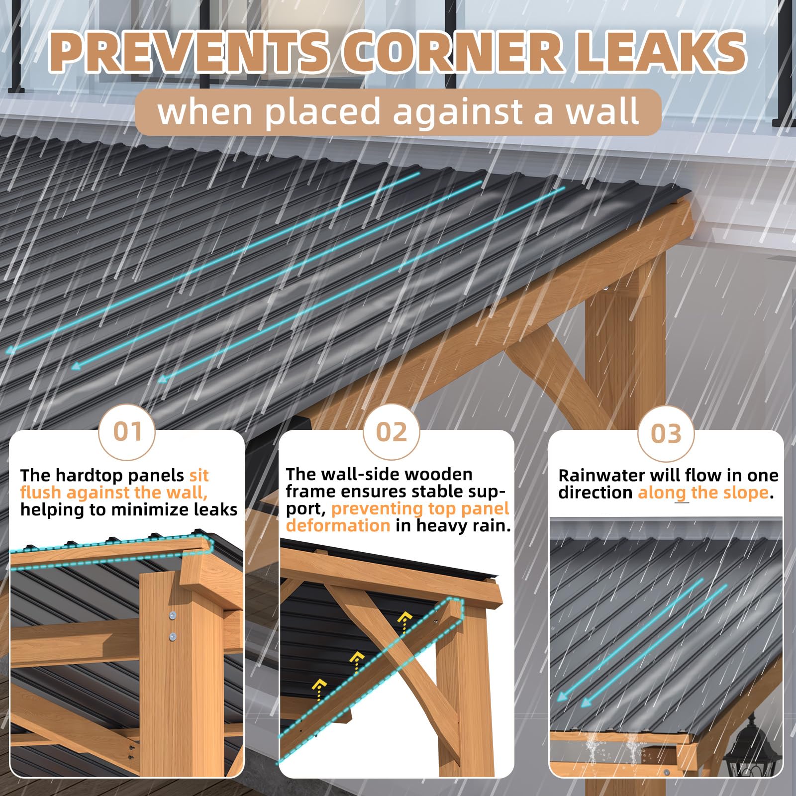 • 【Durability & Stability】Sturdy wooden frame ensures stability, preventing panel deformation in heavy rain. Hardtop fits tightly to the wall, channeling rainwater down the slope to reduce leakage. Withstands winds up to 70 mph and over 20 inches of snow.