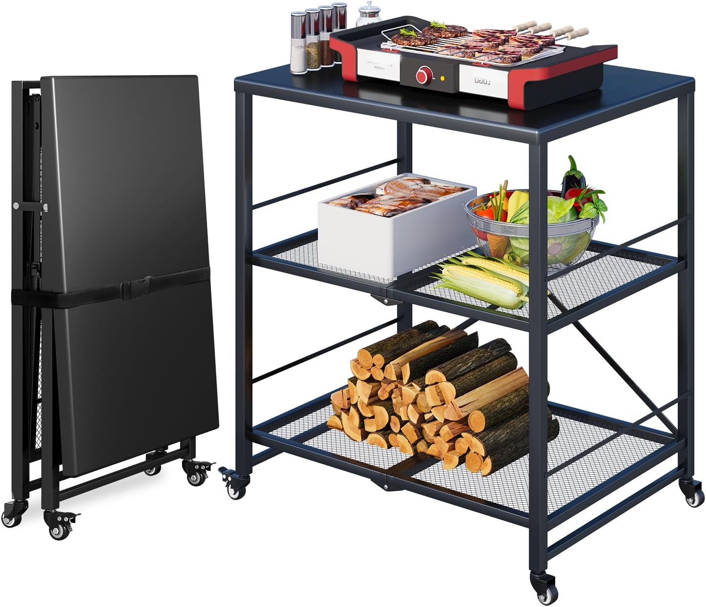 YODOLLA Foldable Stainless Pizza Oven Table,3-Tier Outdoor Grill Cart Trolley on Wheels