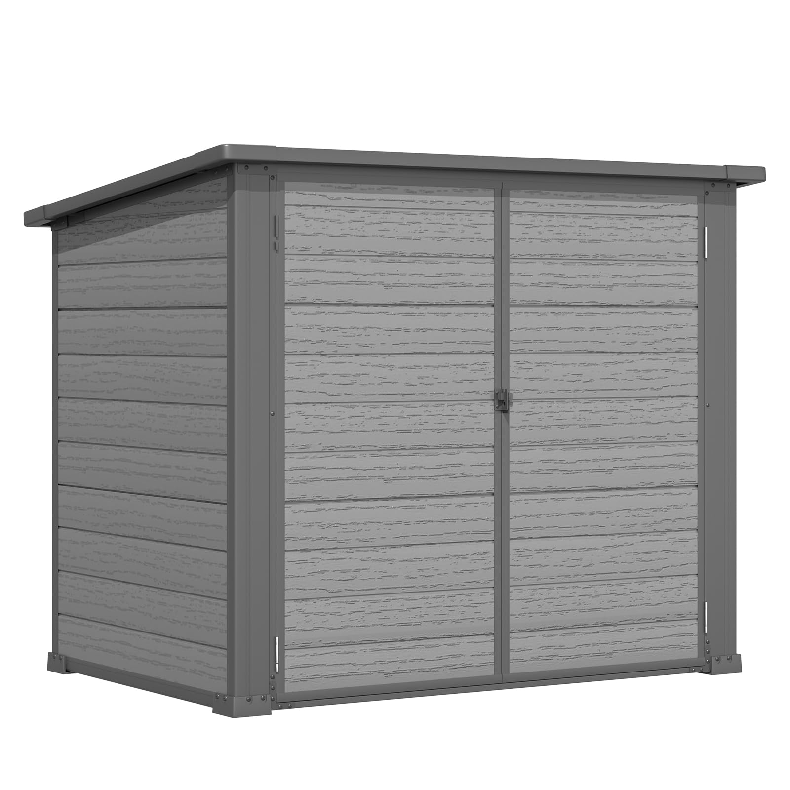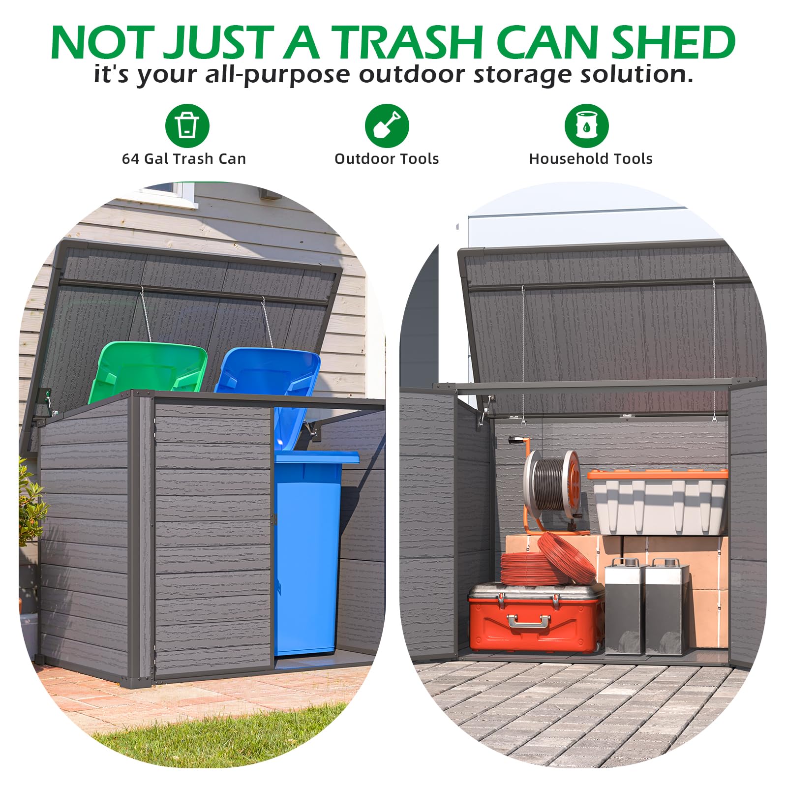 The outdoor trash can storage offers easy installation with a user-friendly guide and detailed manual. Featuring a spacious 61CU.FT capacity, it accommodates trash bins and outdoor tools, ideal for specialized storage needs. The portable and secure design includes independent upward-opening lid hooks and lockable double doors for convenience and safety. Built with a durable resin and sheet metal structure, it resists corrosion and weather conditions.