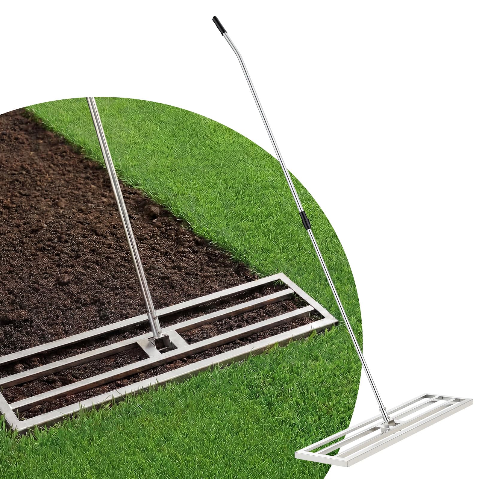 Achieve a smooth, professional finish with this stainless steel lawn leveler rake designed for fast and efficient yard grading. The adjustable lawn leveling tool extends from 125–195 cm to suit different users and lawn sizes. Built with a balanced, durable frame, this heavy-duty lawn leveler spreads soil, sand, and fertilizer evenly for better results than standard rakes. Easy to assemble and versatile for backyards and gardens, it’s the ideal lawn leveling rake for yard care.